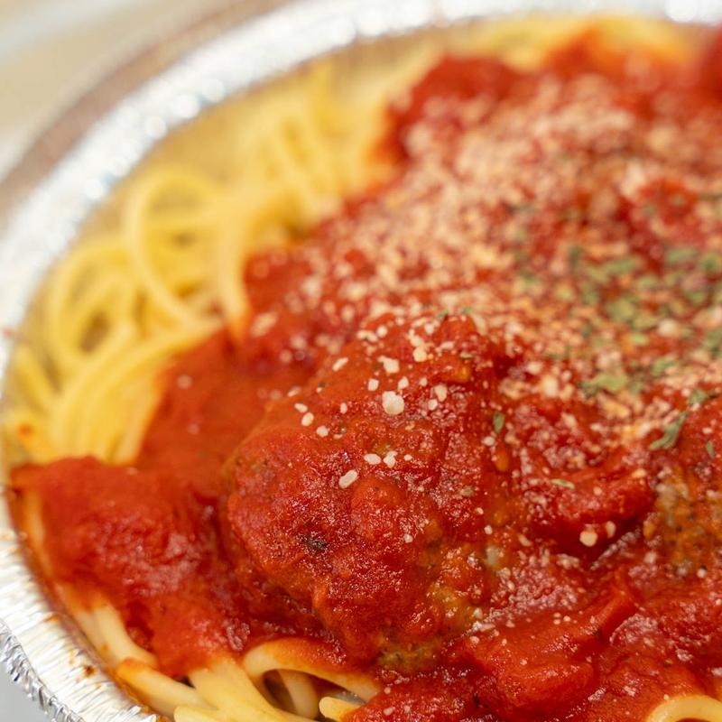 Spaghetti or Ziti pasta and meatballs topped with homemade marinara sauce.